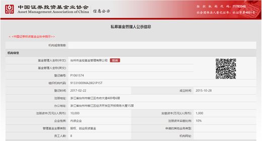 臺州市金控基金管理有限公司已于日前通過了中國證券投資基金業(yè)協(xié)會私募基金管理人登記,登記編號:P1061574。
