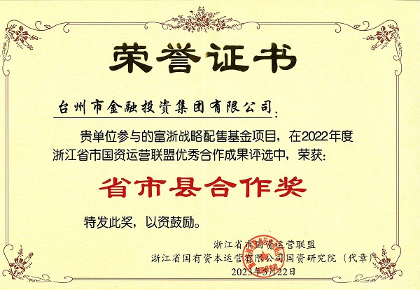 近日,市金投集團(tuán)參與的富浙戰(zhàn)配基金項(xiàng)目,在2022年度浙江省市國(guó)資運(yùn)營(yíng)聯(lián)盟優(yōu)秀合作成果評(píng)選中,榮獲“省市縣合作獎(jiǎng)”。