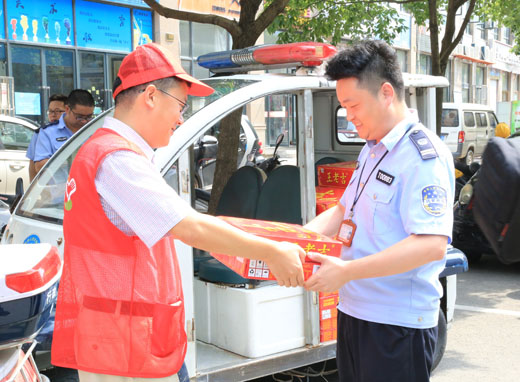 “送清涼”小分隊(duì)走進(jìn)星河苑小區(qū),志愿黨員代表呂志華為門口站崗的保安人員送上飲料,保安大叔笑開了花。