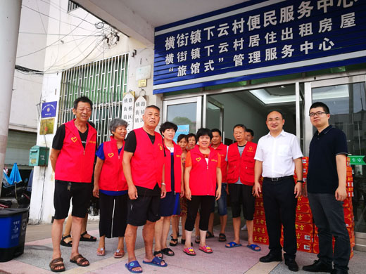 支部委員許長松攜駐村督導(dǎo)服務(wù)組成員陳力行趕赴橫街鎮(zhèn)下云村為當(dāng)?shù)氐纳鐓^(qū)志愿服務(wù)者以及環(huán)衛(wèi)工人送“清涼”。