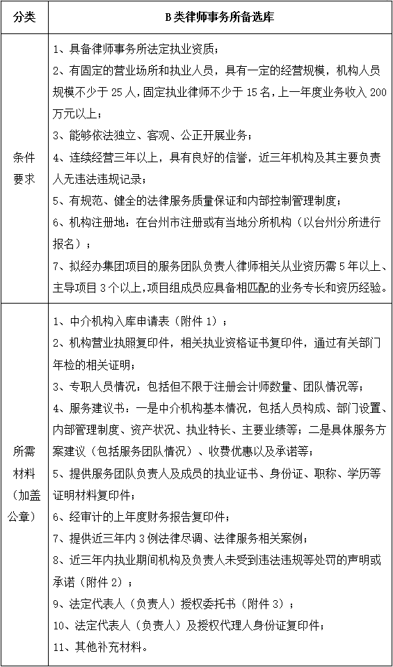 為更好的滿足集團(tuán)財(cái)務(wù)審計(jì)、財(cái)務(wù)盡調(diào)、法律服務(wù)、法律咨詢等專業(yè)服務(wù)需求,集團(tuán)擬對會計(jì)師事務(wù)所、律師事務(wù)所備選庫開展中介機(jī)構(gòu)入庫申報(bào)選聘工作,現(xiàn)將有關(guān)事項(xiàng)公告如下: