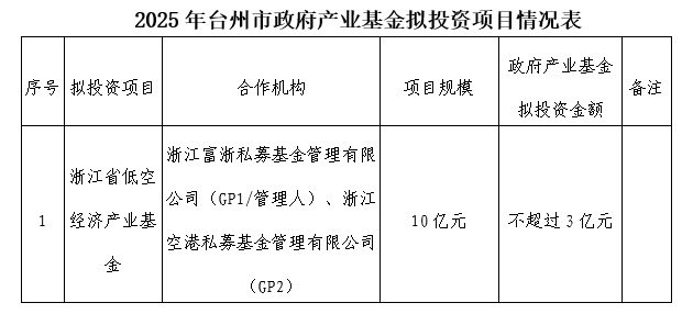 根據(jù)《臺(tái)州市政府產(chǎn)業(yè)基金管理辦法》(臺(tái)財(cái)企發(fā)〔2021〕6號(hào))等有關(guān)規(guī)定,為充分發(fā)揮政府產(chǎn)業(yè)基金引領(lǐng)作用,臺(tái)州市政府產(chǎn)業(yè)基金擬組建非定向基金投向低空領(lǐng)域,已由臺(tái)州市金融投資集團(tuán)有限公司決策委員會(huì)(基金管理委員會(huì))審議通過(guò),現(xiàn)予以公示: